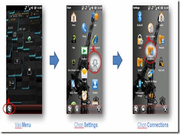 I. Cài đặt Modem connection: vào Start > Settings > Connections tab > Click chọn Connections icon > Ta chỉ cần quan tâm cài đặt Modem trong phần My ISP tại Tasks tab như sau :